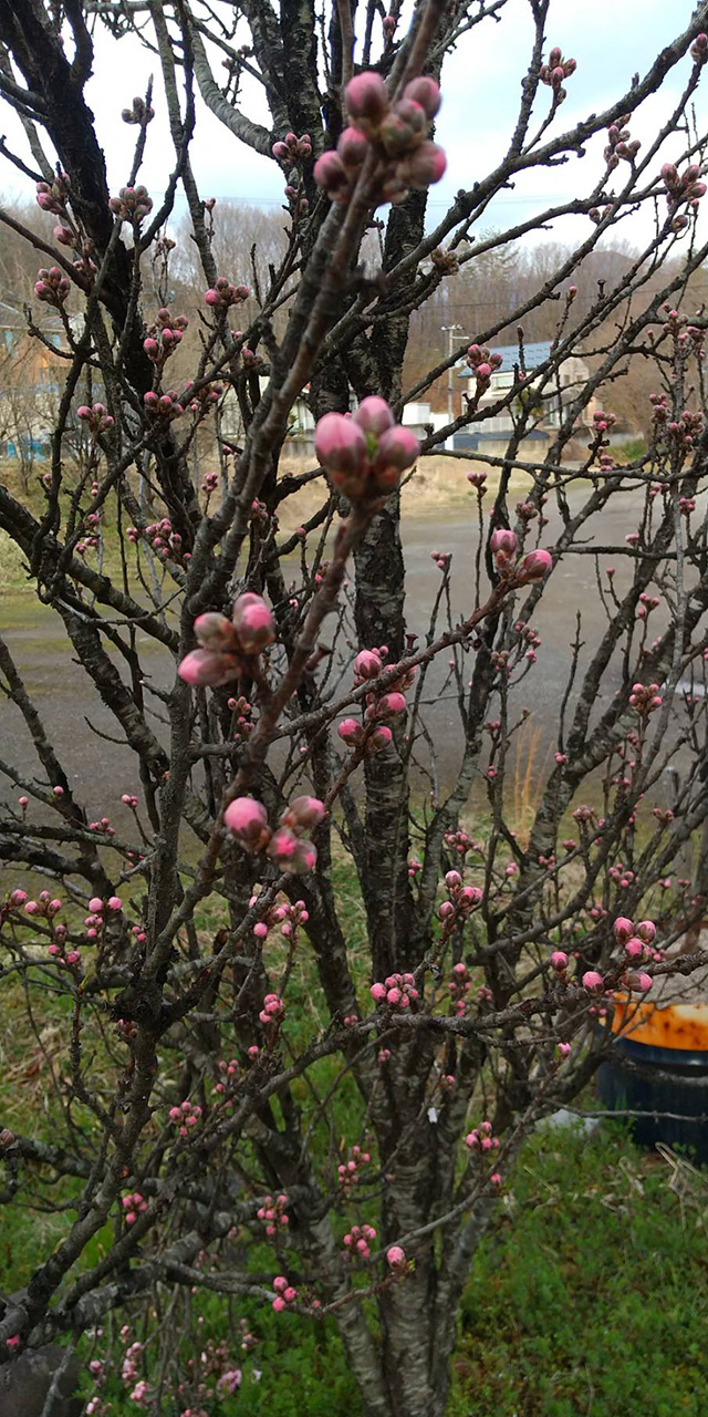 やわらかな春の気配の中、ハナモモとしだれ桜のつぼみが静かに膨らみ始めています。